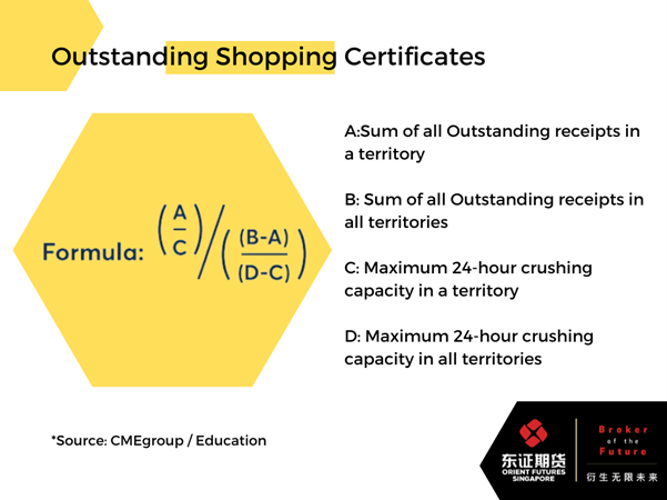 With the above calculations, CBOT calculates the ratio of outstanding shopping certificates in each territory relative to the same ratio for the combined remaining territories. This methodology rebalances differentials so that the number of outstanding shipping certificates relative to the production capacity will be roughly equal across all territories.