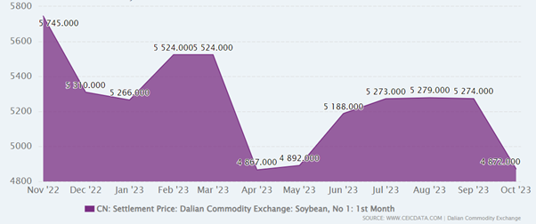According to the data by Ceidata, prices for DCE Soybean No. 1 Futures has been on a decline in 2023, starting at 5,266 RMB/Ton in January 2023 to 4,832 RMB/Ton, as of 21st Dec 2023.